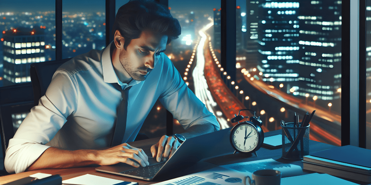 A man in a shirt and tie sits at a desk, working on a laptop.